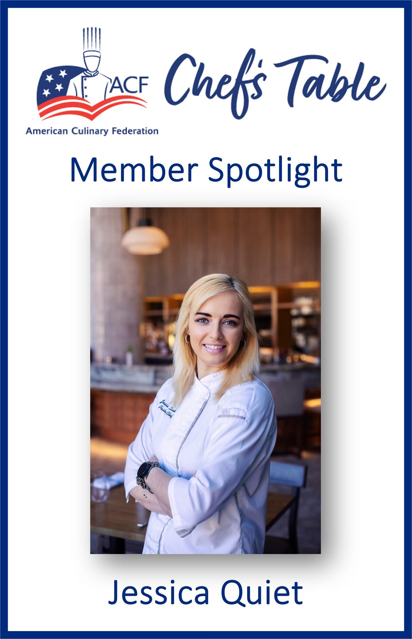Happy holidays, Chefs. On ACF Chef's Table, we like to feature an ACF Chef to recognize his/her/their accomplishments and to help you feel more connected to your fellow chefs even if you're hundreds of miles apart. This month, our ACF Chef's Table November Member Spotlight is Pastry Chef Jessica Quiet!